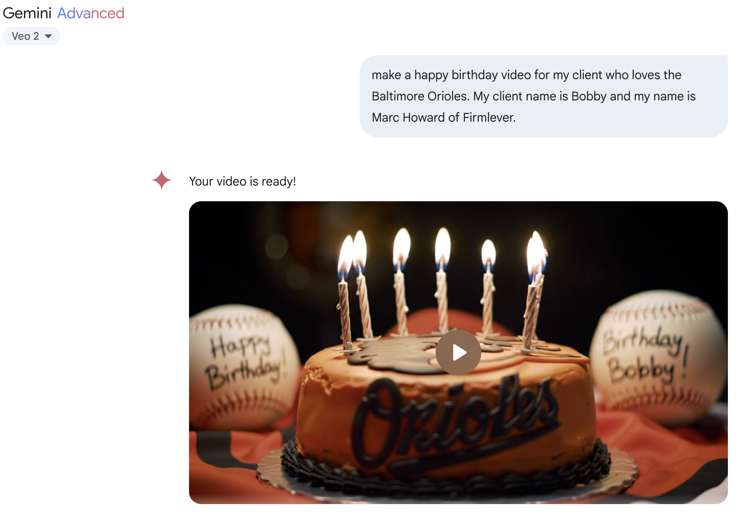 Create AI-generated videos for your clients: By now you have probably received at least one (if not a dozen) cold emails with a cheesy video from some lead gen "expert". Well what if you could save a few hundred bucks and create them on the cheap while delighting your clients? The possibilities are endless: Happy birthday videos, thanks for being a client videos, etc. No need to record yourself, no Loom or anything like that. Just type what kind of vid you want and boom--it's done. This is the new Google Veo 2 that lets you create up to an 8 second video (audio coming soon). To access, go to Google Gemini (Google's version of ChatGPT) and choose Veo 2 from the dropdown (Note: this does require a Gemini Advanced plan starting at $19.99/mo but has a 1-month free trial). Here's one I created for my client "Bobby", a fellow Baltimorean who is a diehard O's fan: (Steal my prompt and access the full video here).