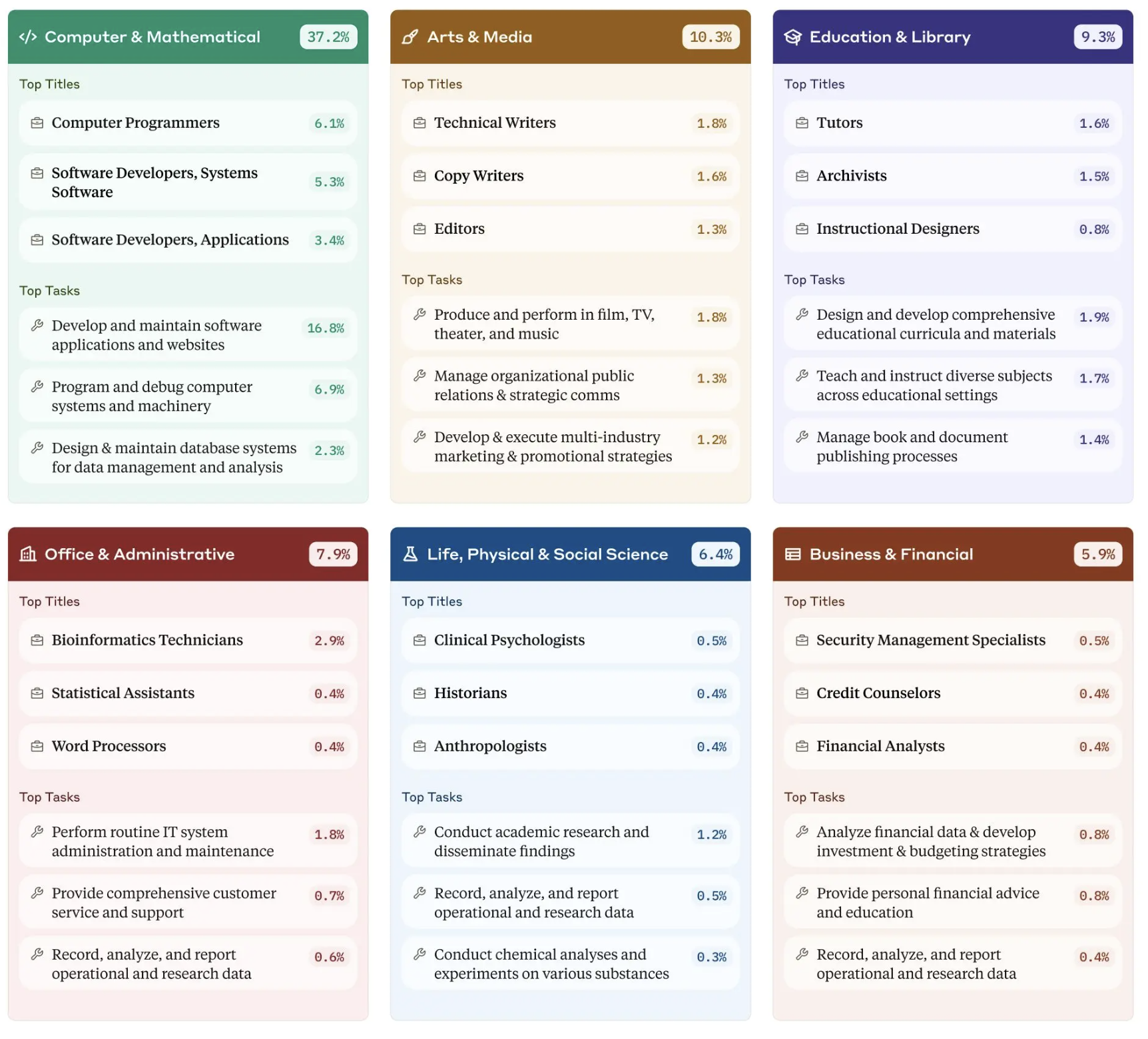 Claude releases its new Anthropic Economic Index. Millions of anonymized conversations were crunched to produce the world's first Economic Index based on AI usage. Notice how less than 6% (bottom right box) is being used today for financial related tasks--this will be a goldmine opportunity for finance pros looking to increase margin. Less than 1% currently used to: