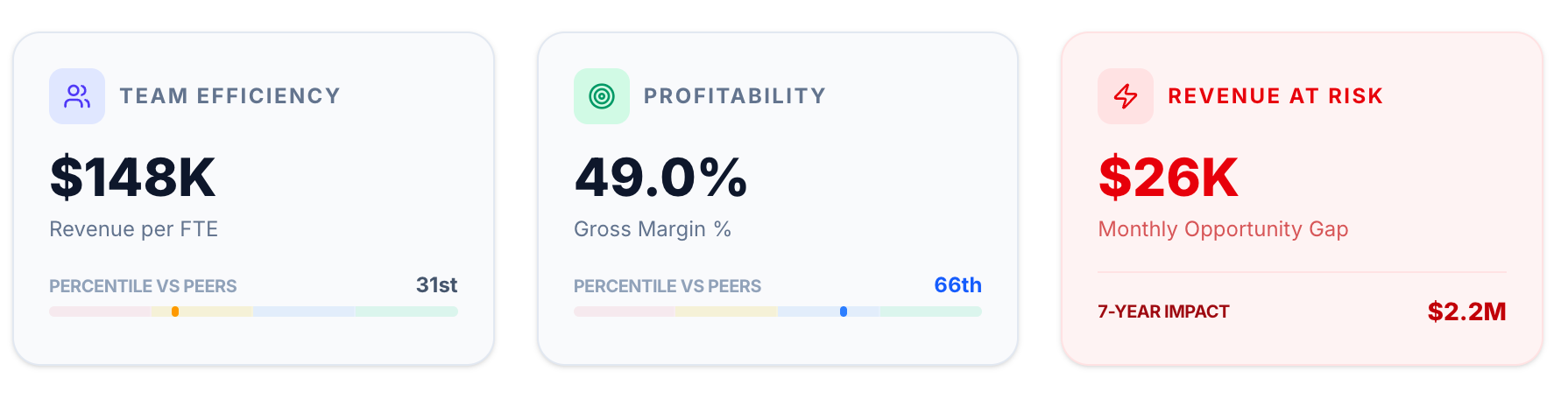 - Compare Rev/FTE, Revenue/Client, Gross and Net Profit Margin, MRR % and about two dozen other metrics (Ready Now)