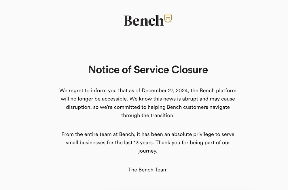 Two days after Christmas 2024, Bench Accounting--a Vancouver-based startup that had raised $113 million and served more than 12,000 small businesses--posted a notice on its website that it was shutting down.