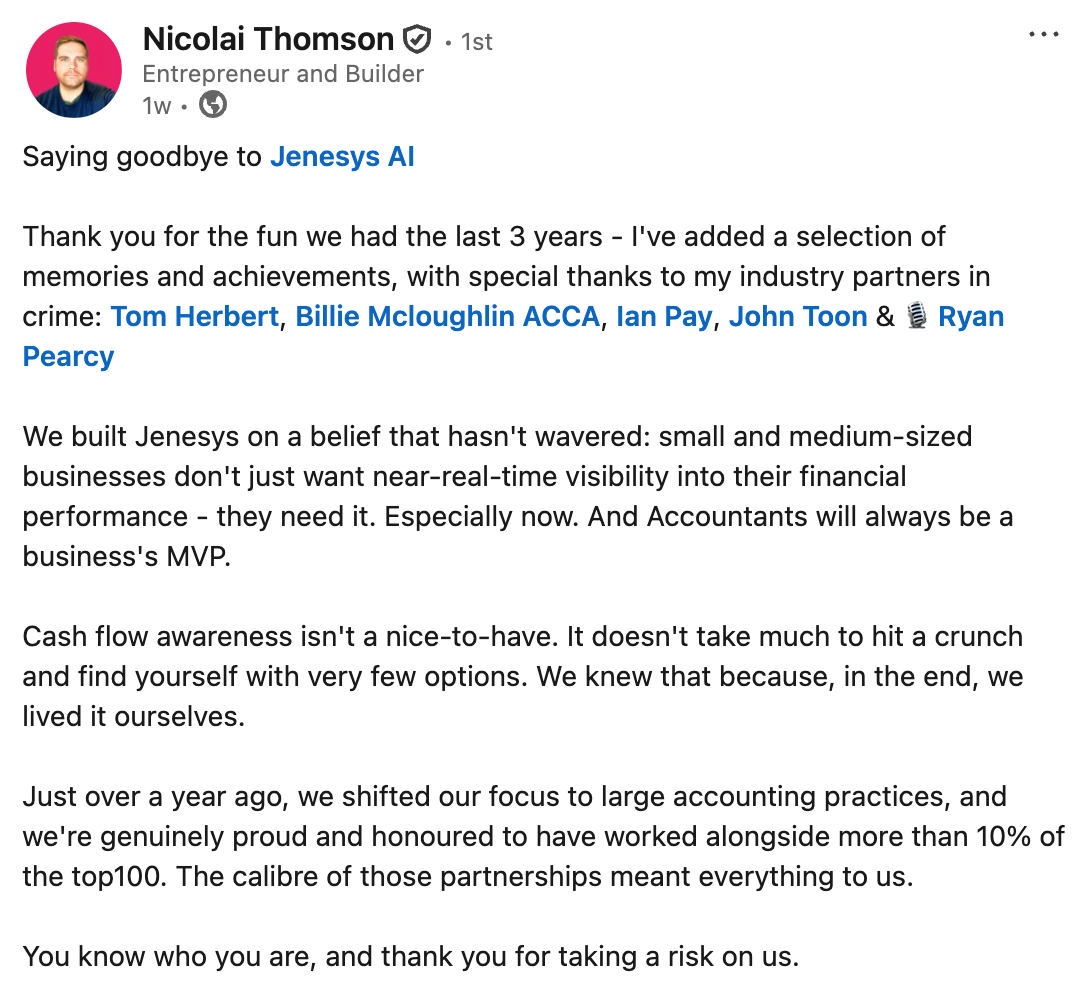 Jenesys AI was a UK-based accounting AI startup that spent three years building a product they called Jack--an AI assistant designed to give accountants and their SMB clients near-real-time financial visibility.