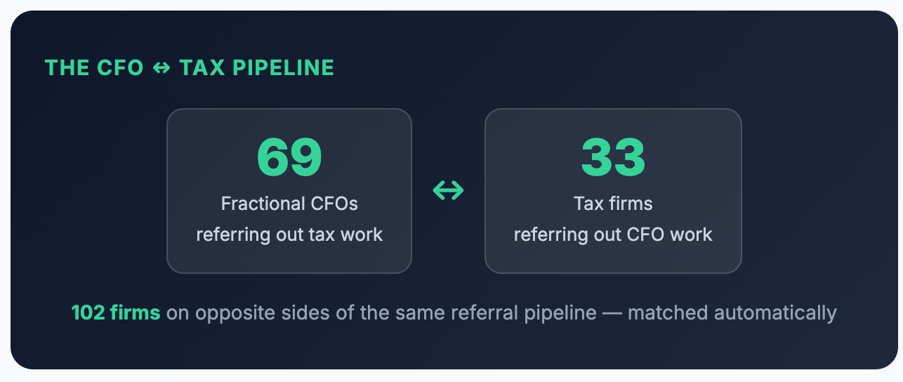 When a fractional CFO posts that they need tax clients referred, the platform surfaces it to CPAs — not other CFOs. When a CPA or tax pro posts looking for bookkeeping work, bookkeepers see it.
