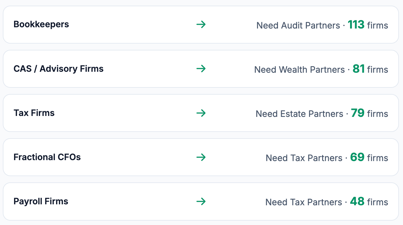 122 accounting firms on FirmLever are actively referring out wealth management and financial planning work — with no wealth advisor to send it to.