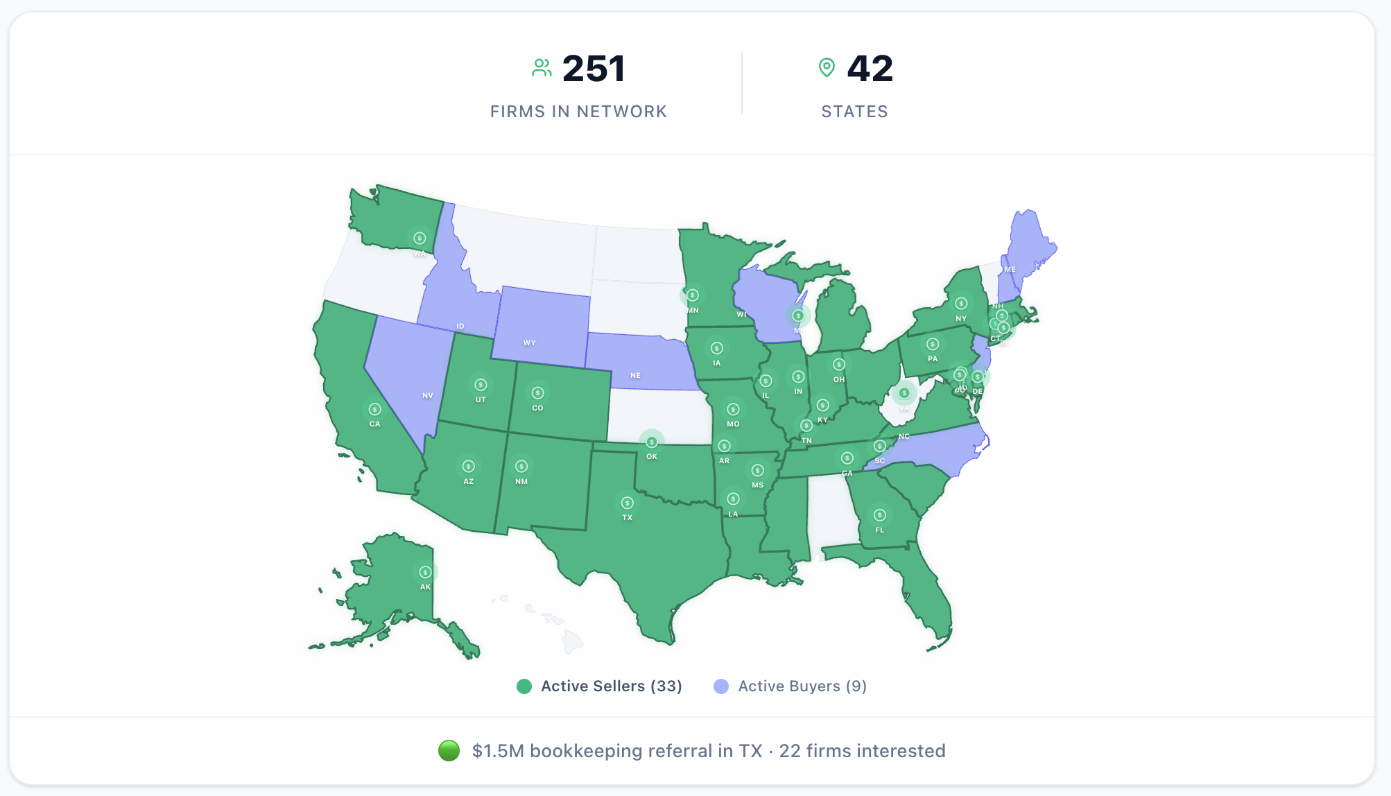 And if you're a full-service firm? This is micro M&A: you're not buying or selling an entire practice. You're listing 5, 10, or 20+ clients you've outgrown and letting the network find the right buyer based on what they actually specialize in.