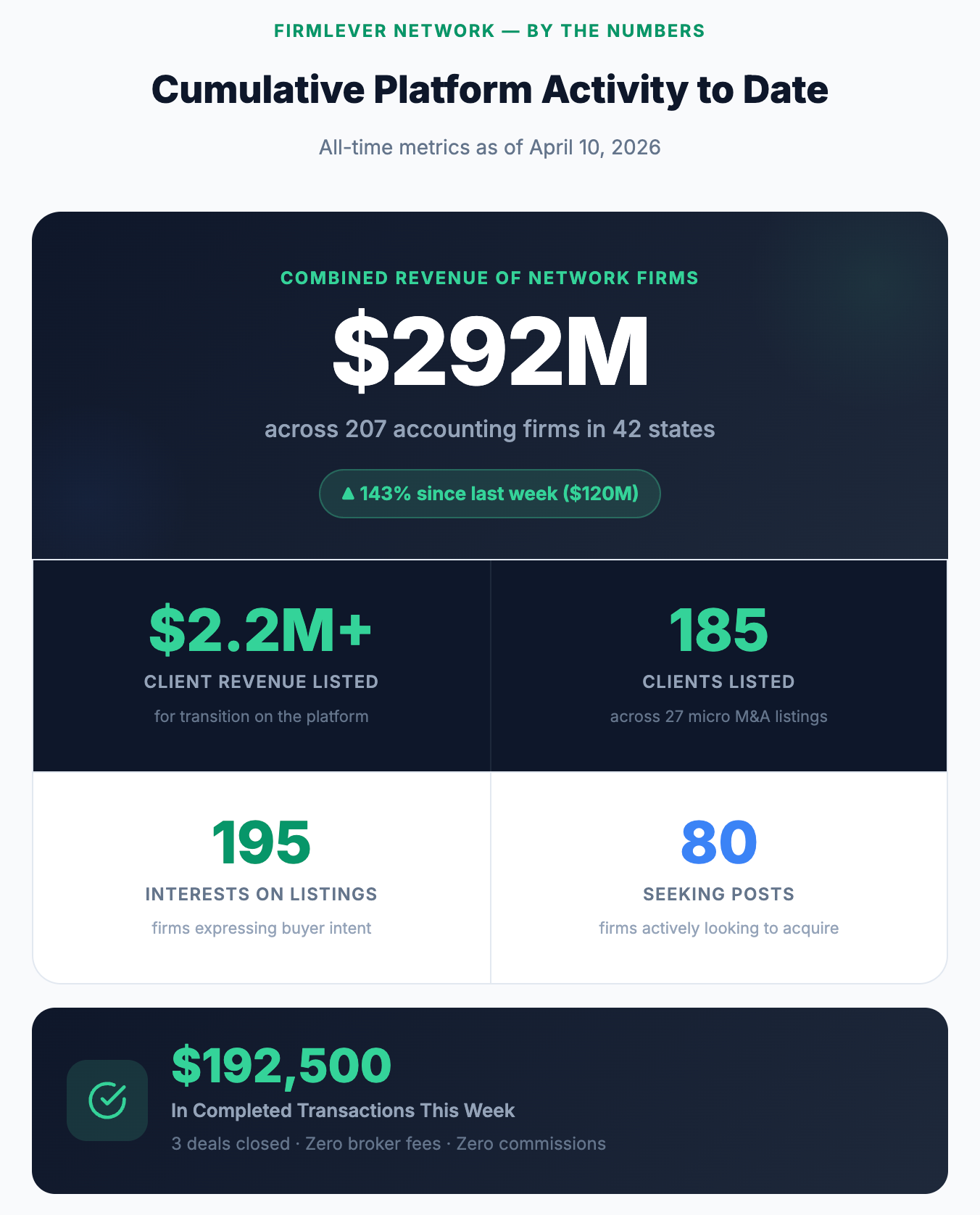 That's it for this week. If you know a CPA, fractional CFO, or wealth advisor who should be in this network — forward this to them (if you do, email me at marc@firmlever.com and I will fast track you both). The scarcity signal is real, and the early movers are already getting matched.